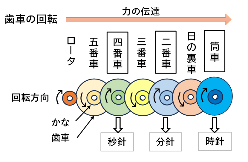 2番車の分針は秒針が60回動くことで1分進みます、筒車の時針は分針が60分進むことで1時間進みます。