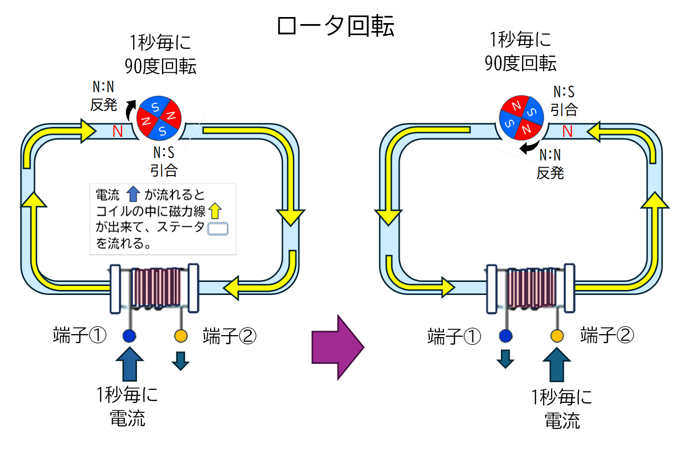 電流の流れは、端子①と②が1秒ごとに入れ替わる為、N極とS極も交互に入れ替わることになりますので、磁力線が流れるところの途中にあるロータ(いわゆる磁石)は、1秒ごとに瞬間的に180度回転、あるいは、90度回転(N極、S極が2個づつある) することになります。