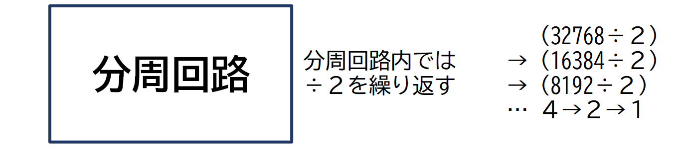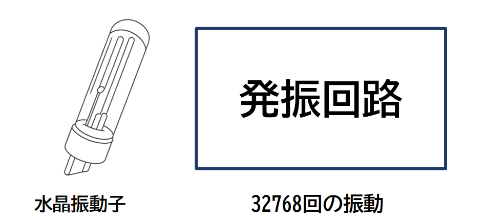 1秒間に32768Hzの信号を、分周回路で一瞬で1秒間に1回の信号に変えます。