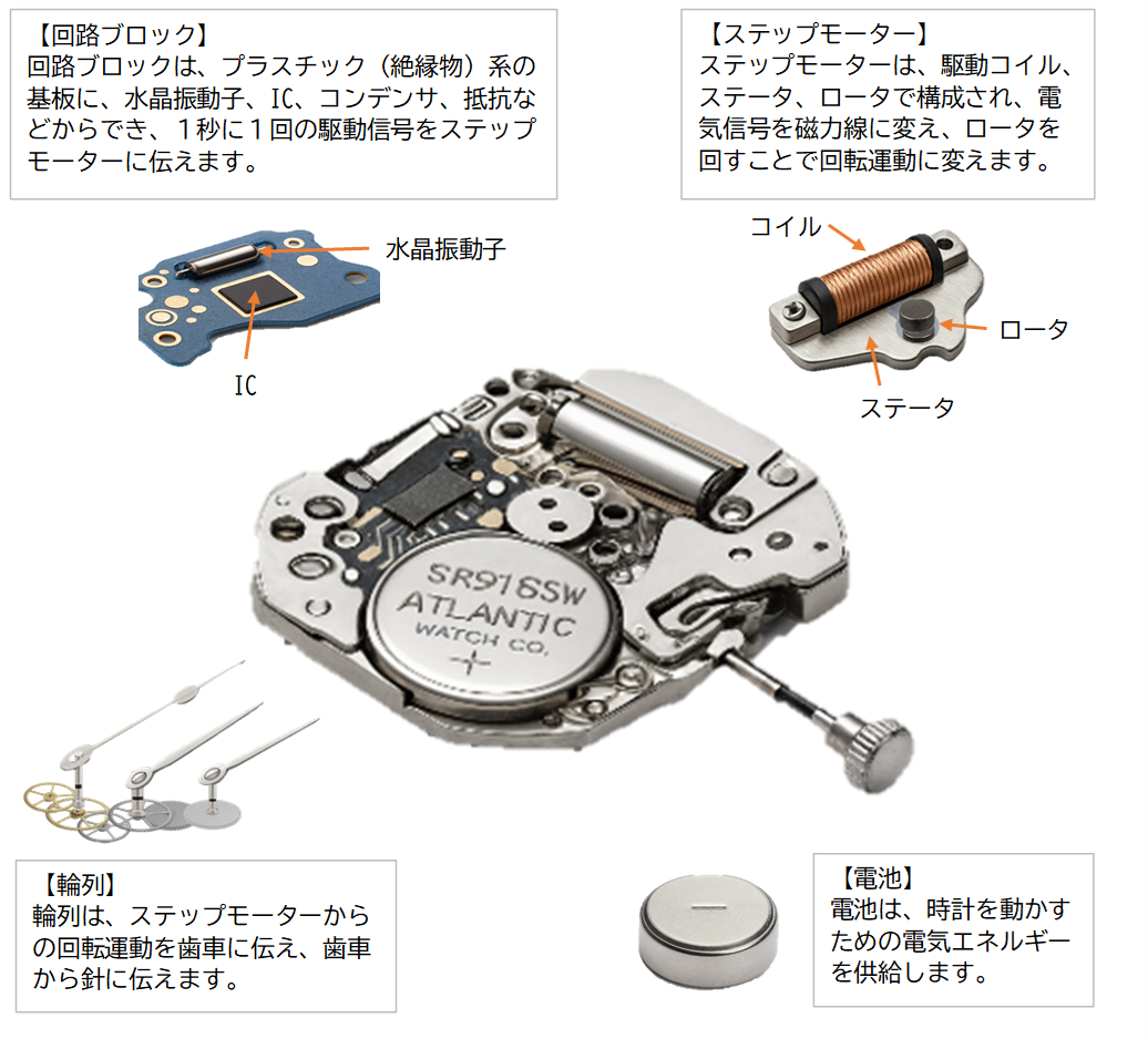 その振動が集積回路に伝えられてパルス信号に変わり、モーターを経由して歯車を回して時計の針を動かしています。