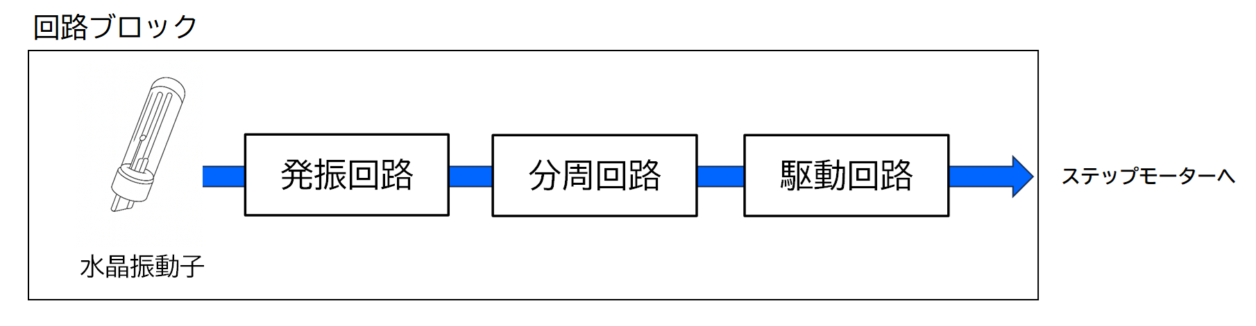 分周回路から伝えられた信号を駆動回路でステップモーターを動かす信号(電流)に作り変え、