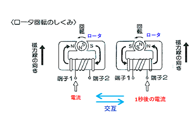 電流の流れは、端子①と②が1秒ごとに入れ替わる為、N極とS極も交互に入れ替わることになりますので、磁力線が流れるところの途中にあるロータ(いわゆる磁石)は、1秒ごとに瞬間的に180度回転、あるいは、90度回転することになります。
