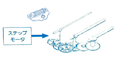 ステップモーターからの回転運動を歯車に伝え、歯車から針に伝えます。