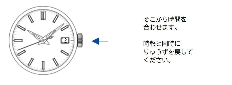 時間合わせの際には、後ろ(50分方向)から分針を進み合わせましょう。