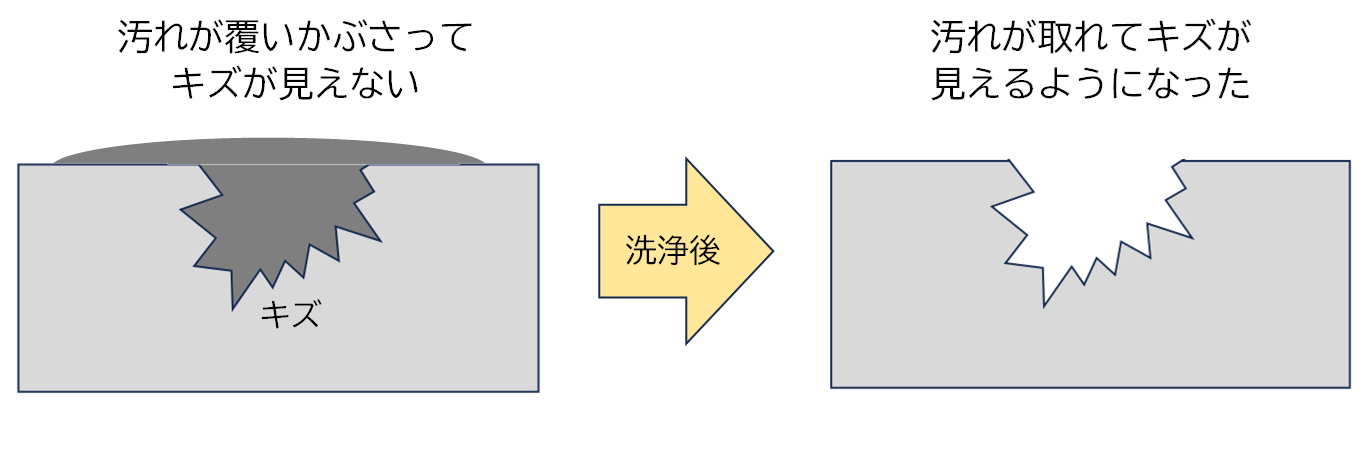 修理完了後には洗浄を行いますので、古いキズ部分を埋めていたゴミが取れてしまうことにより、新しいキズが出来てしまったように見えることも多々あります。