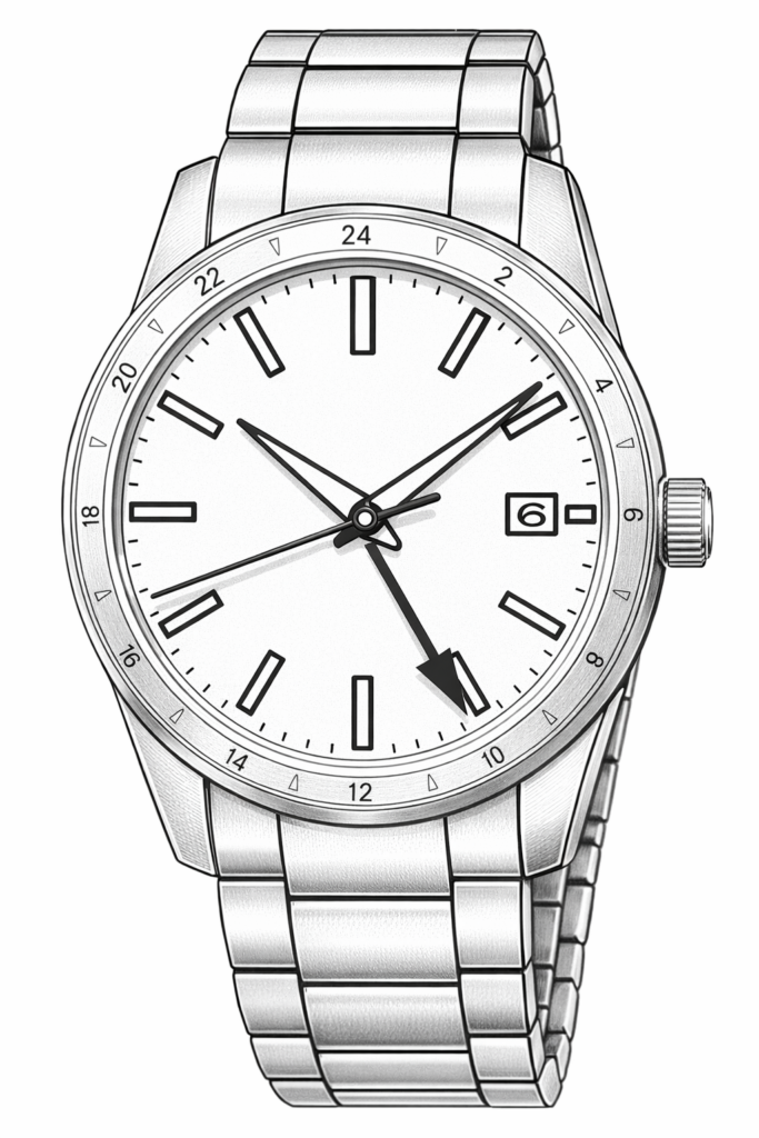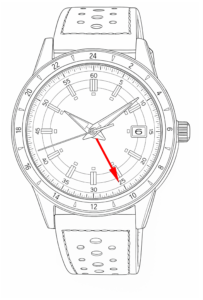 メーカーによって仕様はさまざまですが、一般的なGMTウオッチには時針・分針・秒針と共に24時間で1周する針(24時間針またはGMT針)、24時間針が指し示す24時間表示が備わっており、GMTウオッチの特徴となっています。