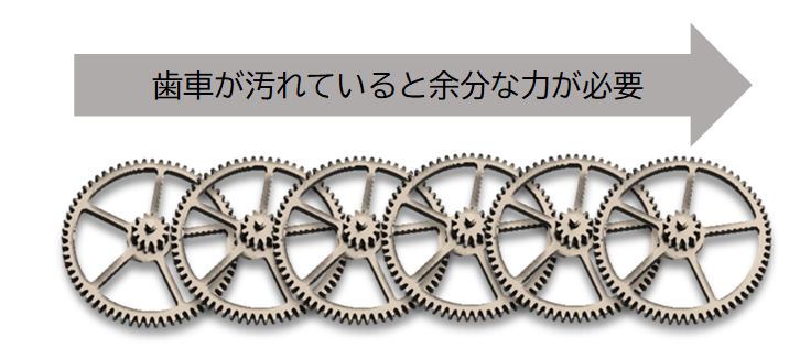 理由として、製造された部品がミクロン単位では全く同じではなく、それが組まれること、また注油される量も全く同じではないところから、金属の歯車が回って研磨されるので、汚れ方も千差万別と言えます。